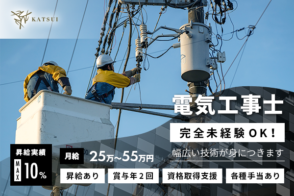 | 対象となる方 | 【必須】 ・普通自動車免許(AT可) 【歓迎】 ・未経験者歓迎 ・無資格者歓迎 ・経験者歓迎 ・ブランクOK ・学歴不問 ・電気工事士の資格をお持ちの方は尚可 ・20代〜40代のスタッフが活躍中の職場です |